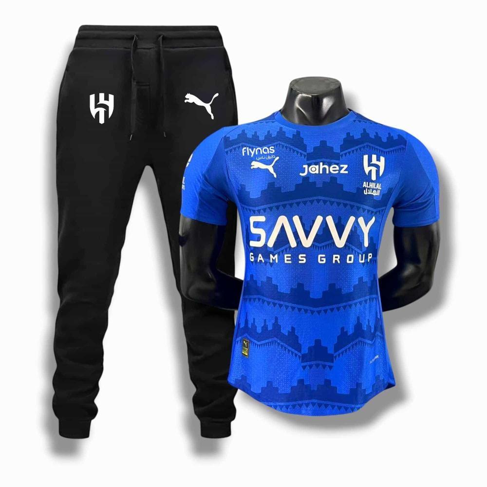طقم الهلال الاساسي يتكون من تيشيرت الهلال الازرق الجديد 2026 مع بنطلون اسود مناسب للشتاء بتصميم عملي ومريح للاستخدام اليومي والتمارين يتوفر بجميع المقاسات مع خيار طباعة الاسم والرقم حسب الطلب