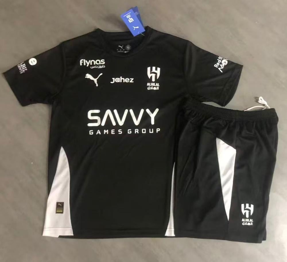 اللون الأساسي أسود مع شعار نادي الهلال باللون الأبيض على الصدر.